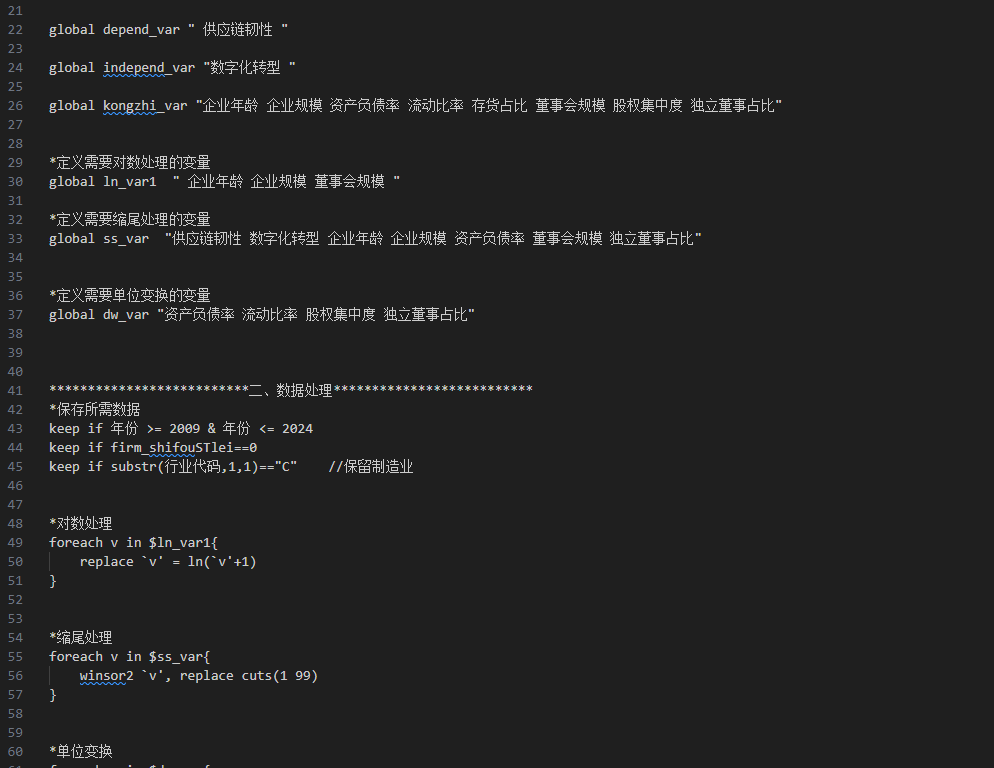 本文基于2009-2024年我国A股上市公司企业数据,考察数字化转型对制造业供应链韧性的影响参照《统计研究》王梓琪(2025)的做法,对《数字化转型与制造业供应链韧性》一文中的基准回归部分进行复刻