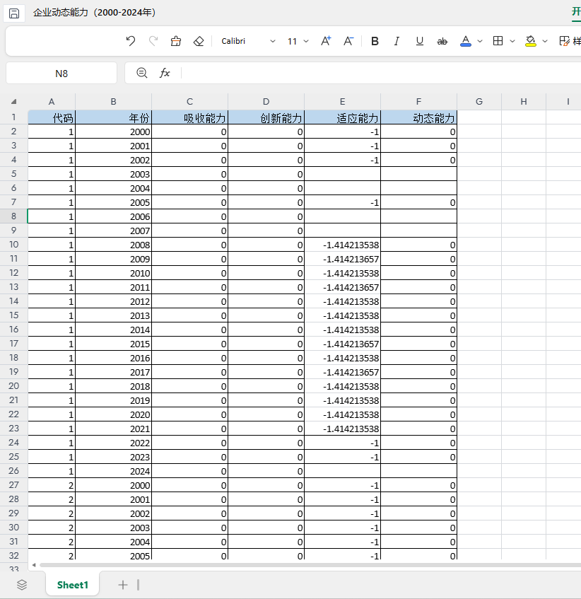 包含指标:代码 年份 吸收能力 创新能力 适应能力 动态能力
