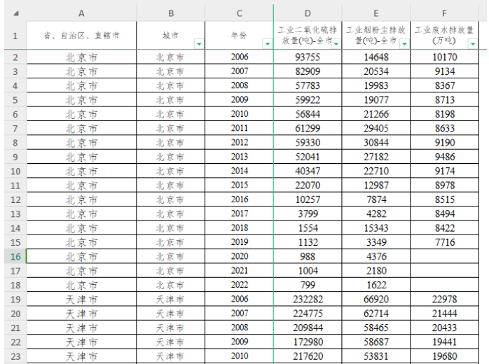 2.数据指标:省、自治区、直辖市、城市、年份、工业二氧化硫排放量、工业烟粉尘排放量、工业废水排放量。