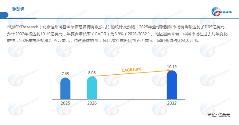 根据QYResearch最新调研报告显示,预计2032年全球碳酸钾市场规模将达到1019百万美元,未来几年年复合增长率CAGR为3.94%。