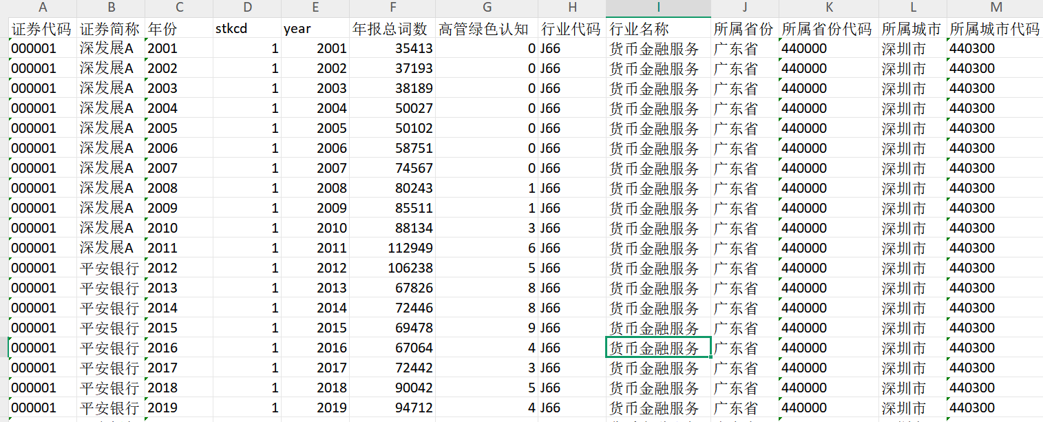 3、指标:证券代码、证券简称、年份、stkcd、year、年报总词数、高管绿色认知、行业代码、行业名称、所属省份、所属省份代码、所属城市、所属城市代码