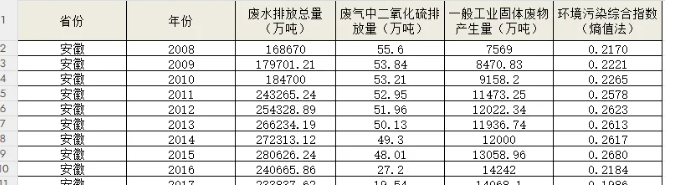 具体指标:废水排放总量、废气中二氧化硫排放量、一般工业固体废物产生量、环境污染综合指数。