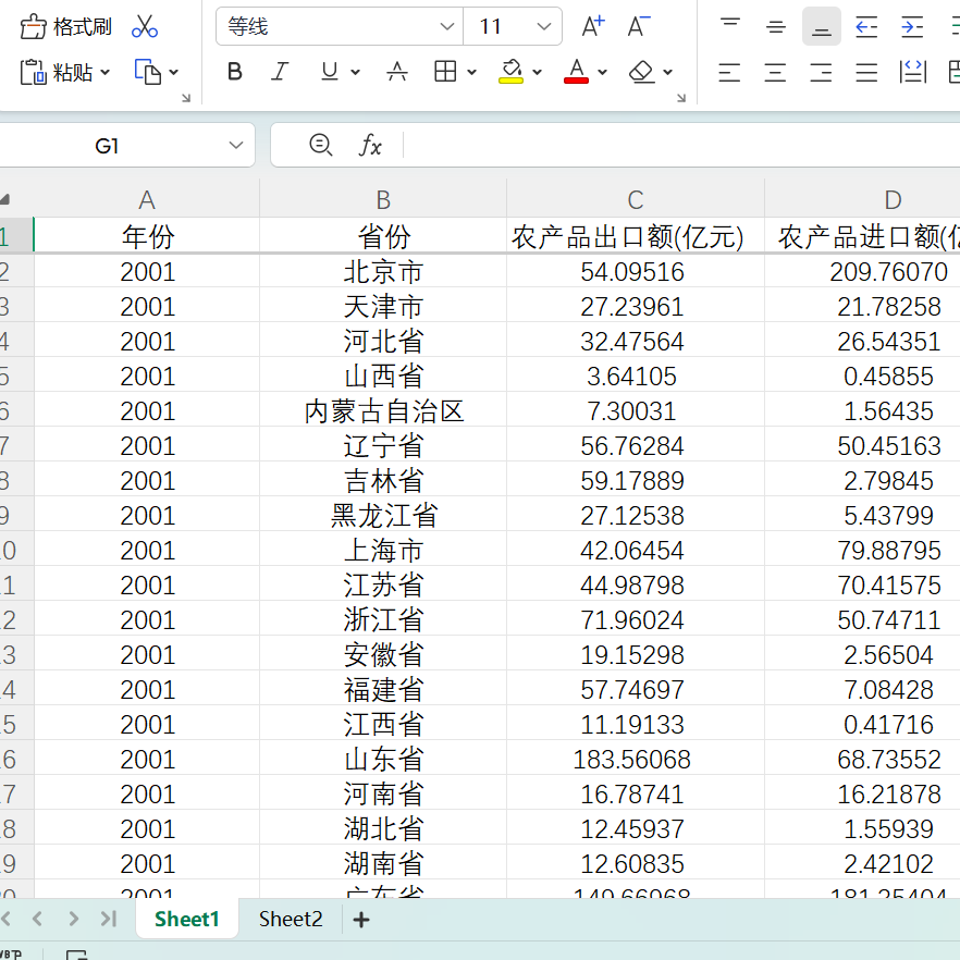 3、指标:年份、省份、农产品出口额(亿元)、农产品进口额(亿元)、农产品出口额(万美元)、农产品进口额(万美元)