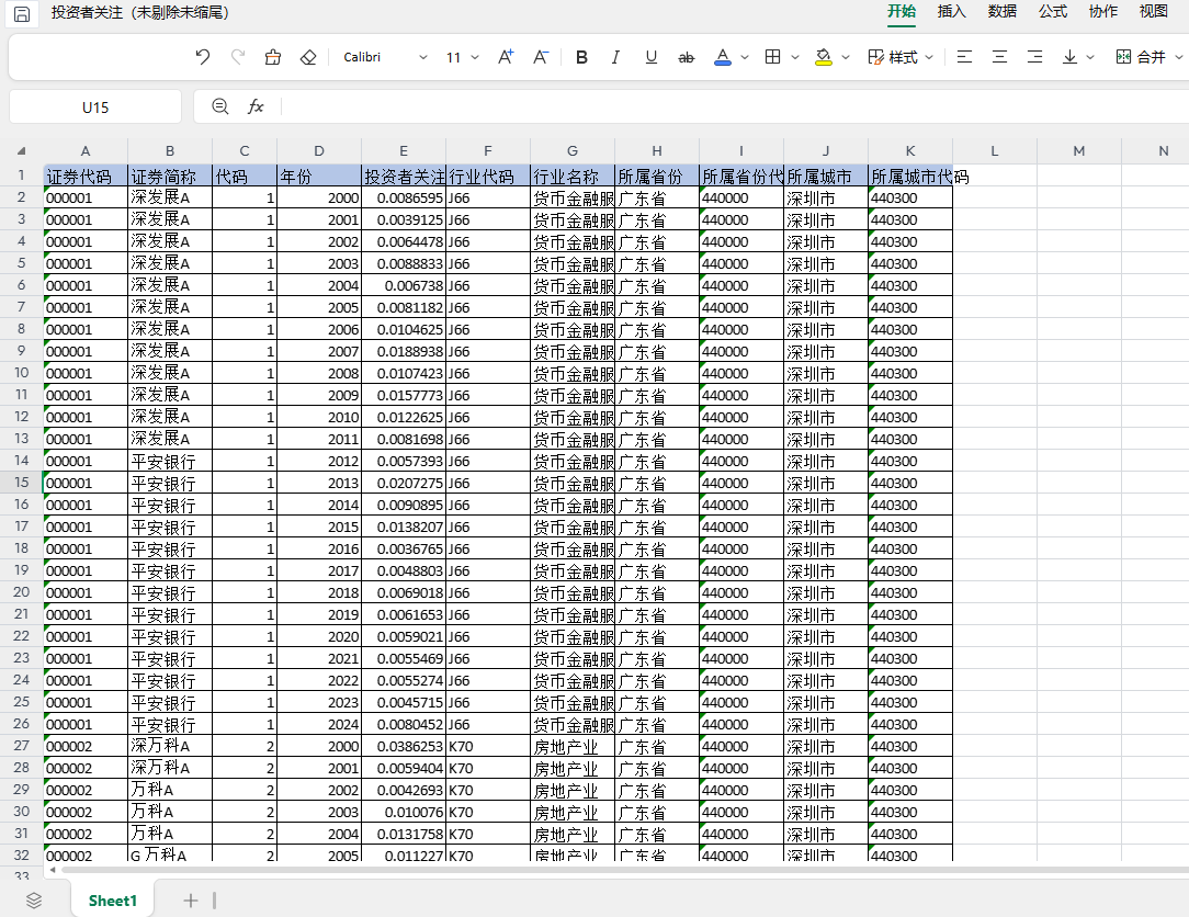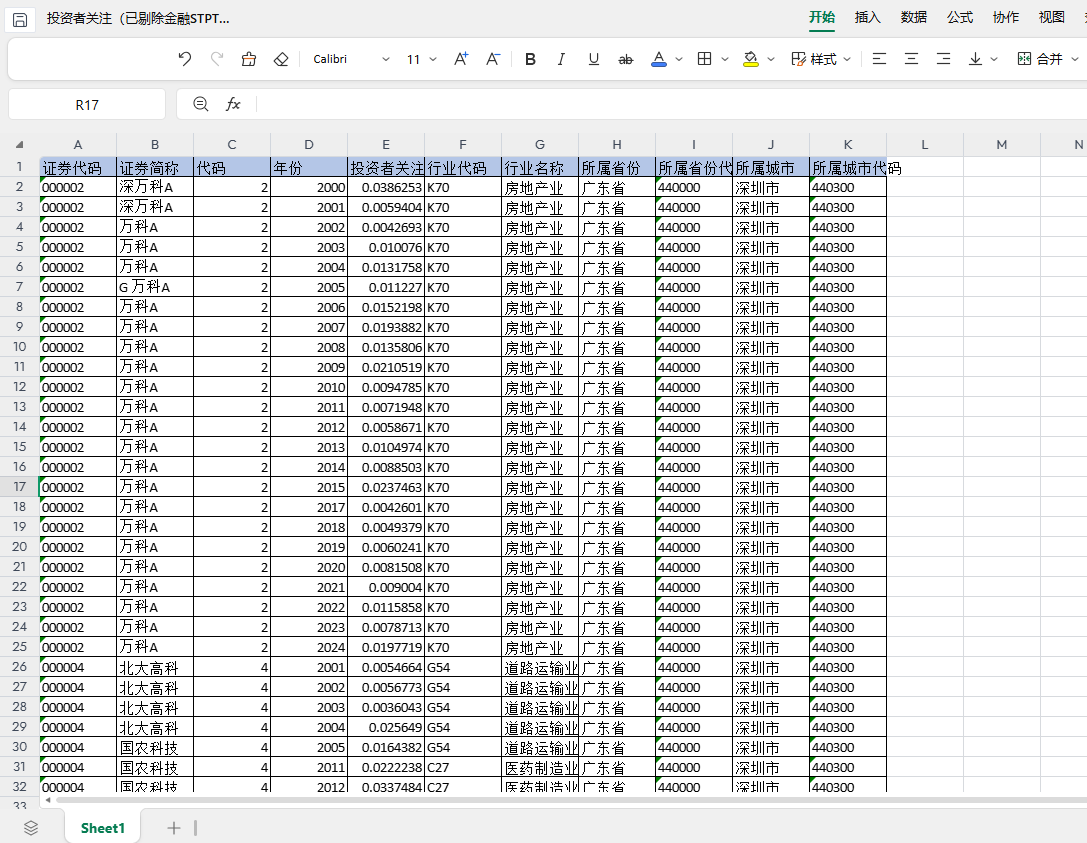包含指标:证券代码 证券简称 代码 年份 投资者关注 行业代码 行业名称 所属省份 所属省份代码 所属城市 所属城市代码