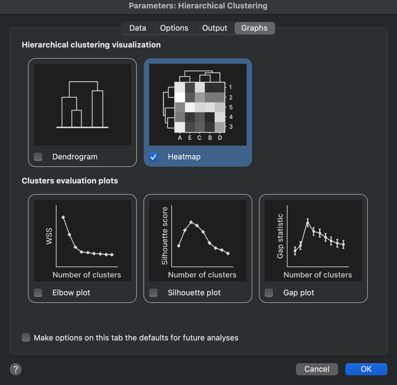 层次聚类分析最常见的输出形式,是热图和树状图的可视化展示。在分析参数的此选项卡中,您可以指定要生成那些图表,作为分析结果的一部分输出。