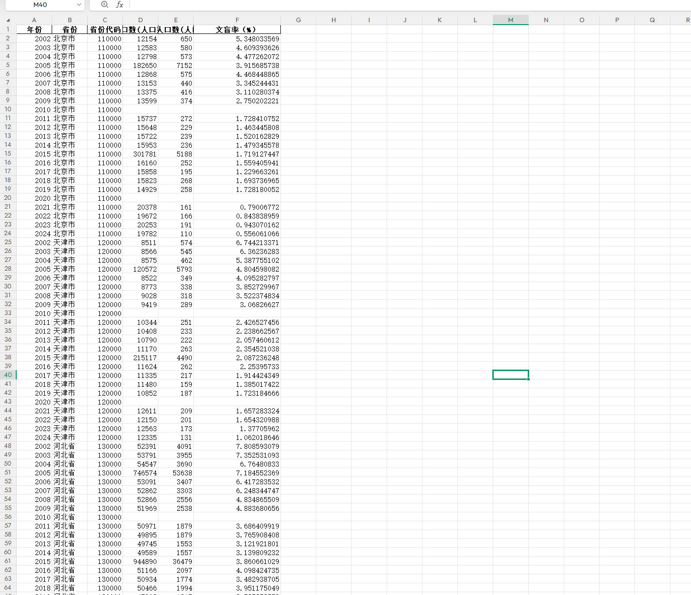 本数据集提供中国 31 个省(自治区、直辖市)2002-2024 年的文盲率及相关人口数据。