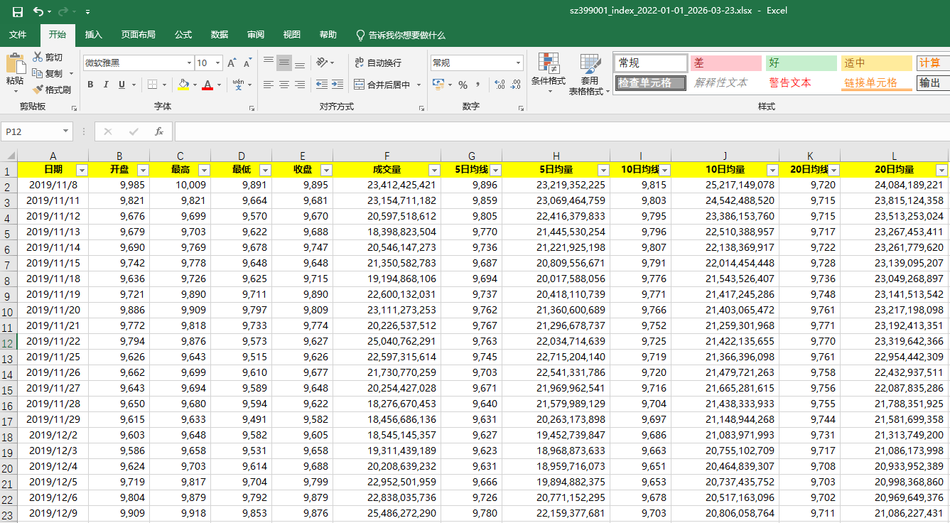 深证成指指数每日开盘价、收盘价、最低价、最高价、成交量、5日均线、10日均线、20日均线数据2019.11.08—2026.3.23