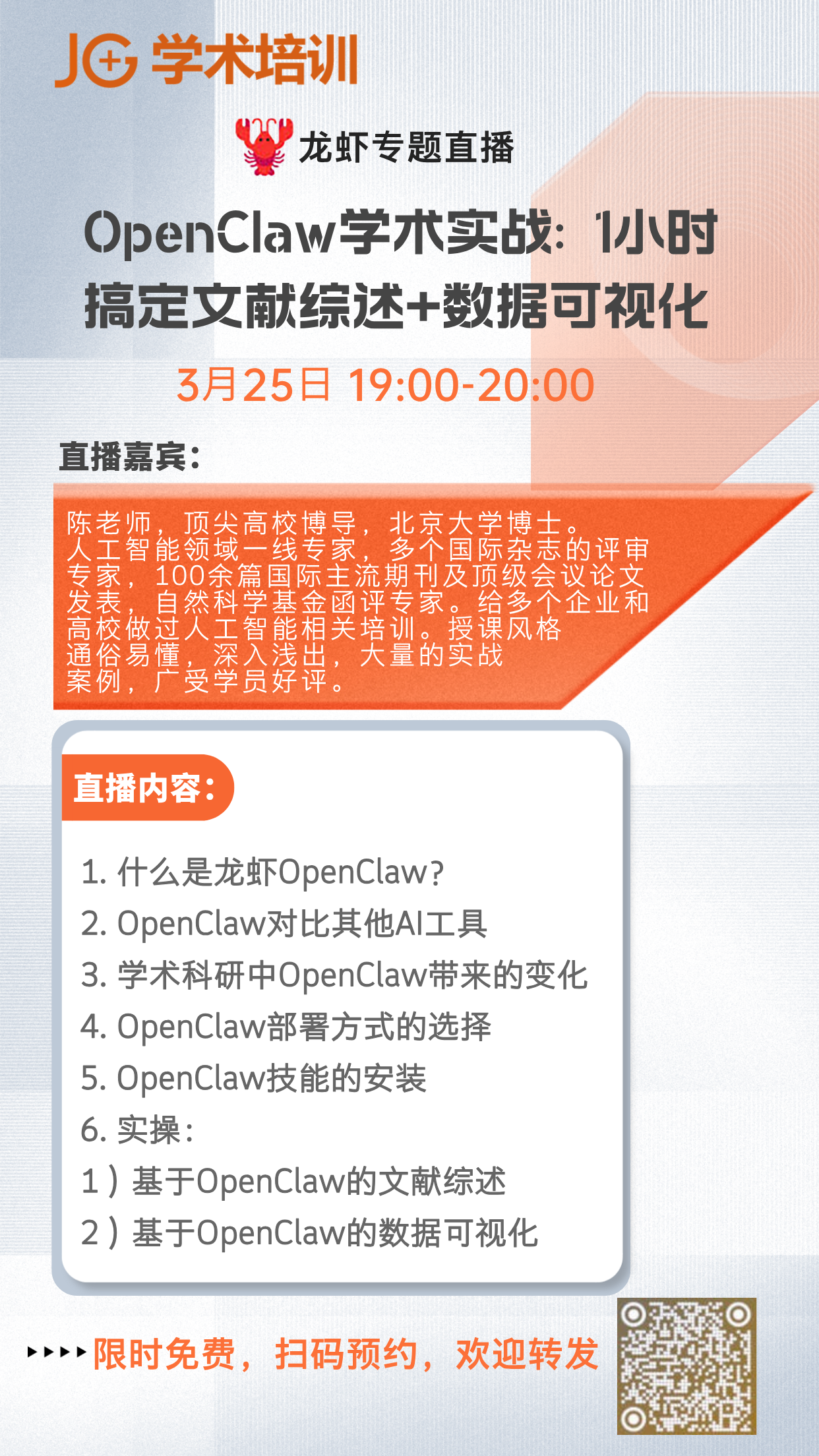 陈教授不仅精通OpenClaw的核心逻辑,更懂科研人的真实痛点——知道你在文献检索时最烦多平台切换,明白你在数据处理时最怕出错,清楚你在论文写作时最愁格式排版。课程全程干货无废话,拒绝晦涩的技术参数,用大白话讲清原理,手把手带练操作,课后专属答疑,你的每一个科研难题,都能得到专业解答。
