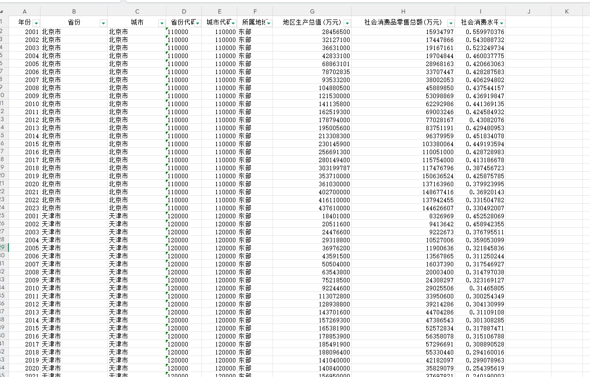 3、指标:年份、省份、城市、省份代码、城市代码、所属地域、地区生产总值(万元)、社会消费品零售总额(万元)、社会消费水平