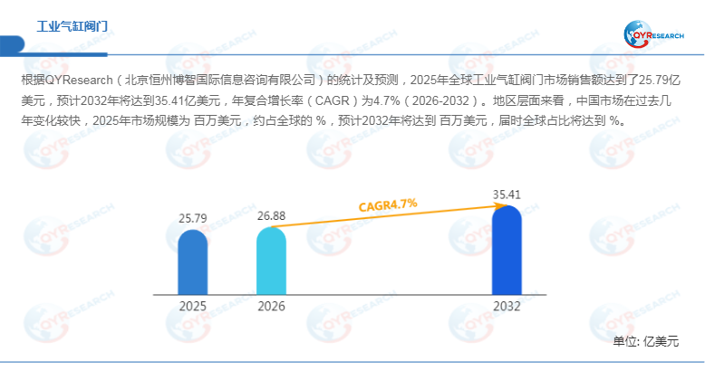 根据QYResearch最新调研报告显示,预计2032年全球工业气缸阀门市场规模将达到3541百万美元,未来几年年复合增长率CAGR为4.7%。