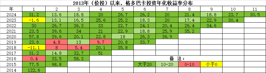 从收益率分布图可以看出,当从任一年份起,投资时间超过4年后,年化收益率一般很少低于20%,即使有少数数据点的数据低于20%,离20%也相去不远,这大概就是巴菲特在早期致股东信中说的要给他3-5年时间的原因。