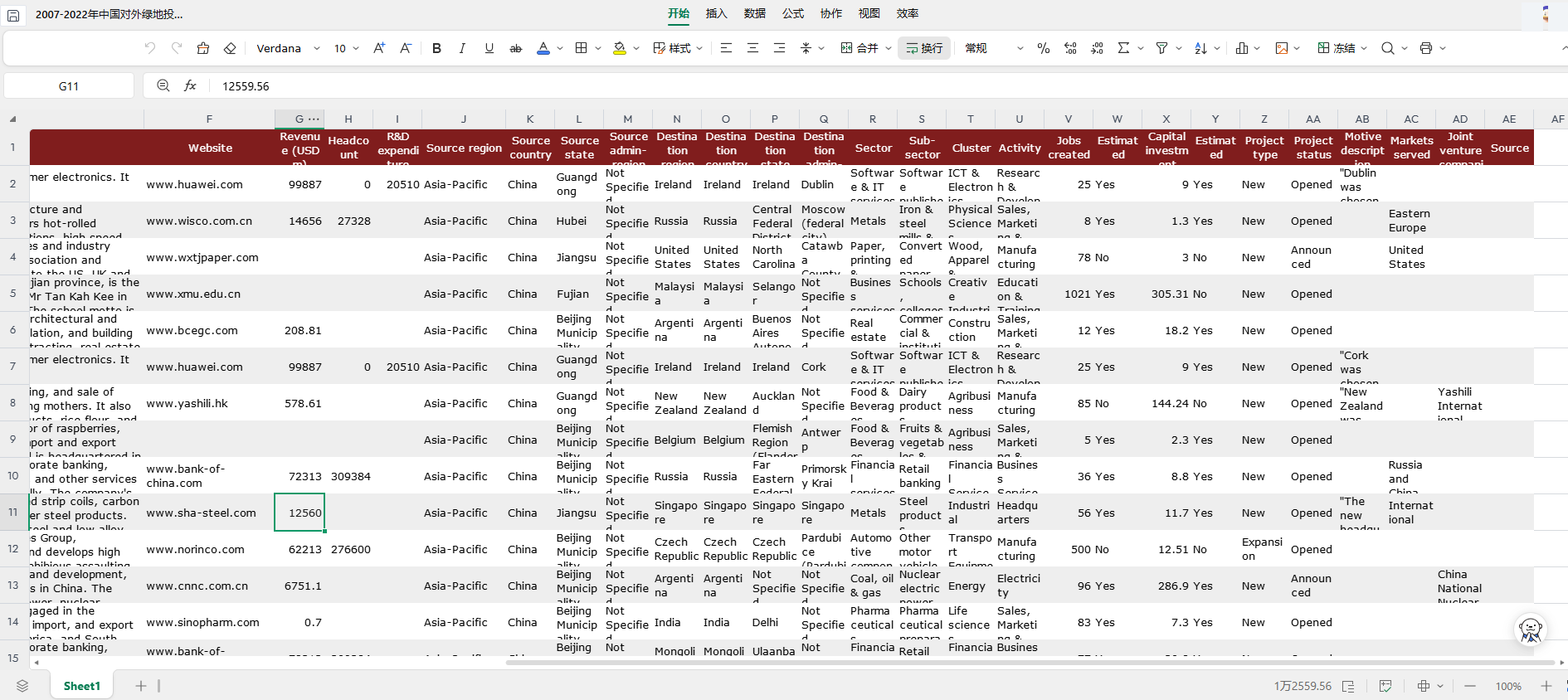 包含指标:Project date Investing company Parent company Company profile Website Revenue (USD m) Headcount R&D expenditure (USD m) Source region Source country Source state Source admin-region (US county) Destination region Destination country Destination state Destination admin-region (US county) Sector Sub-sector Cluster Activity Jobs created Estimated Capital investment Estimated Project type Project status Motive description Markets served Joint venture companies Source