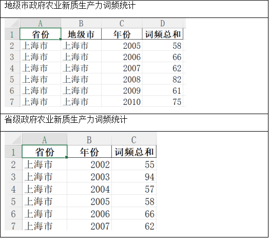 本数据集展示了2001-2024年各省政府工作报告中的农业新质生产力词频统计数据。