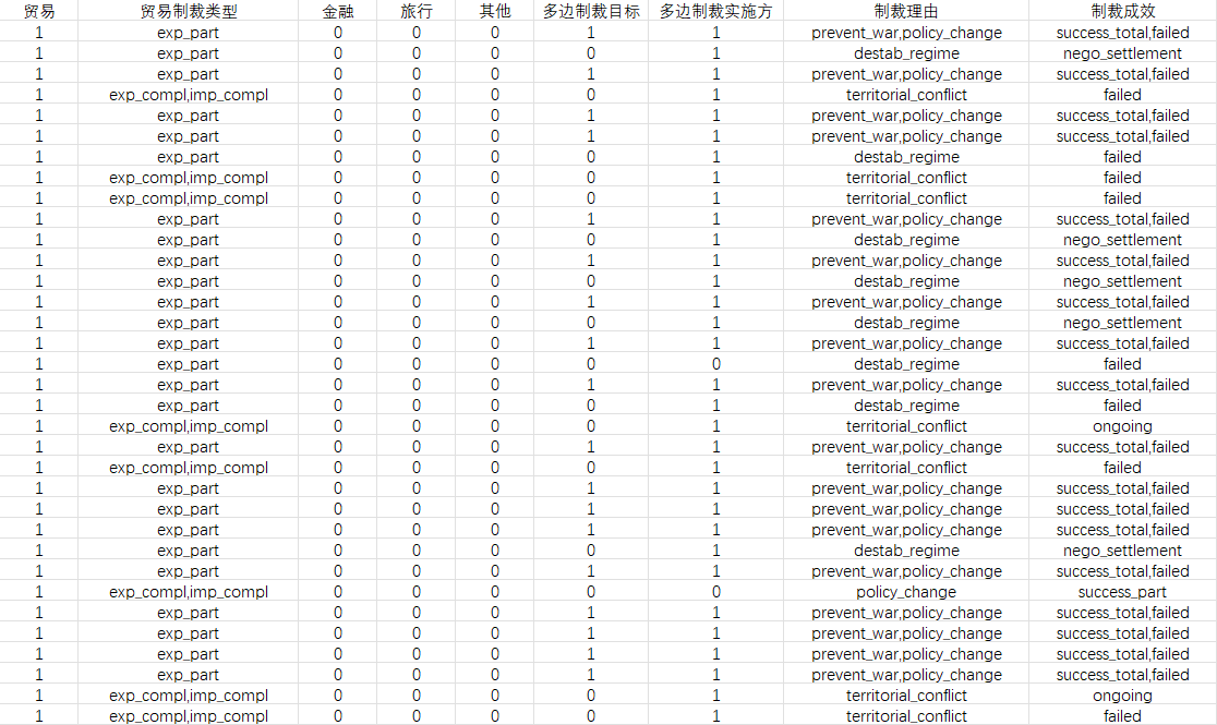 另外,该数据库分为两个子数据库,一个仅宽泛记录,当中“被制裁方”和“制裁发起方”包含一个或多个政治实体,而另一个则将记录扩展为细致记录,即每个观测值为一个实体对另一实体发起的制裁。