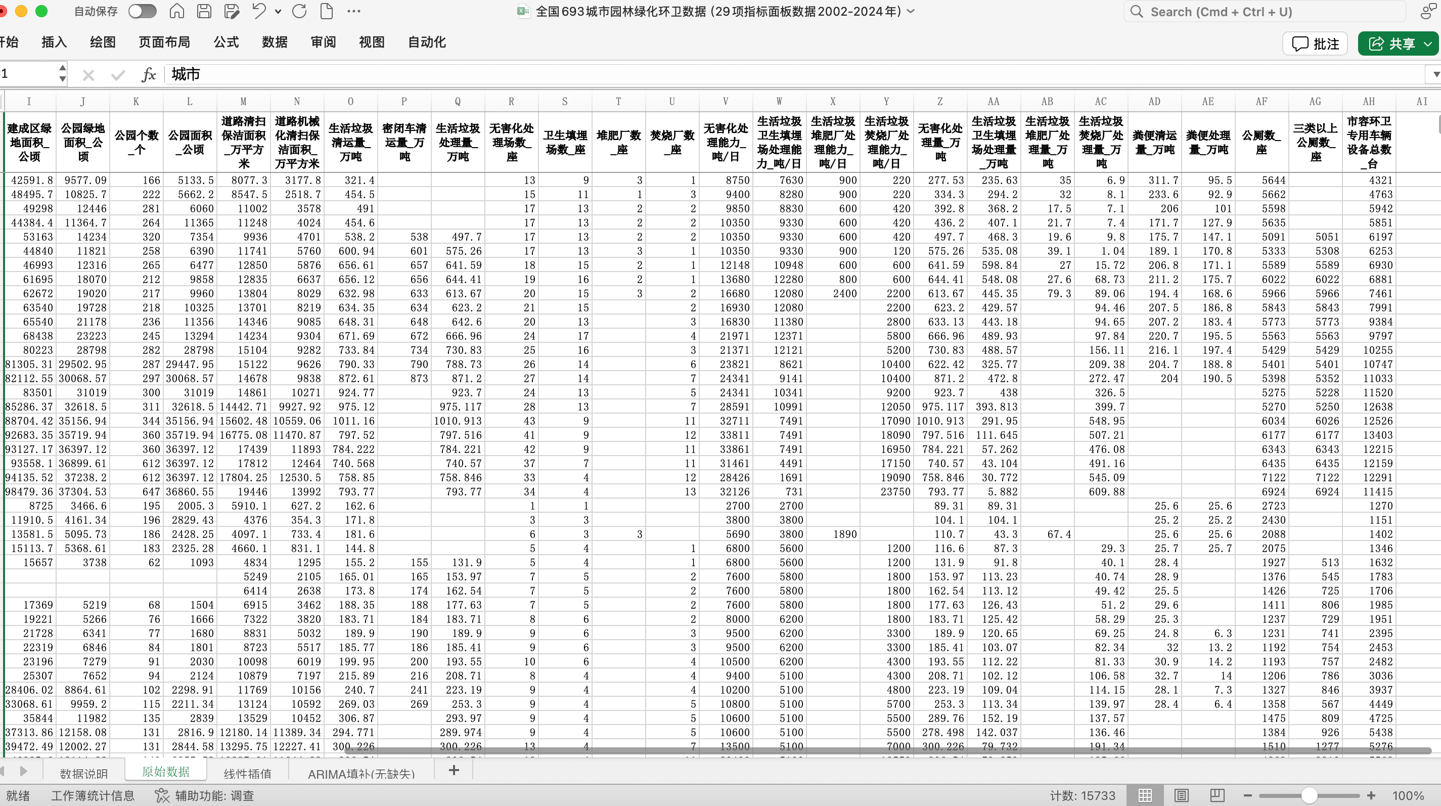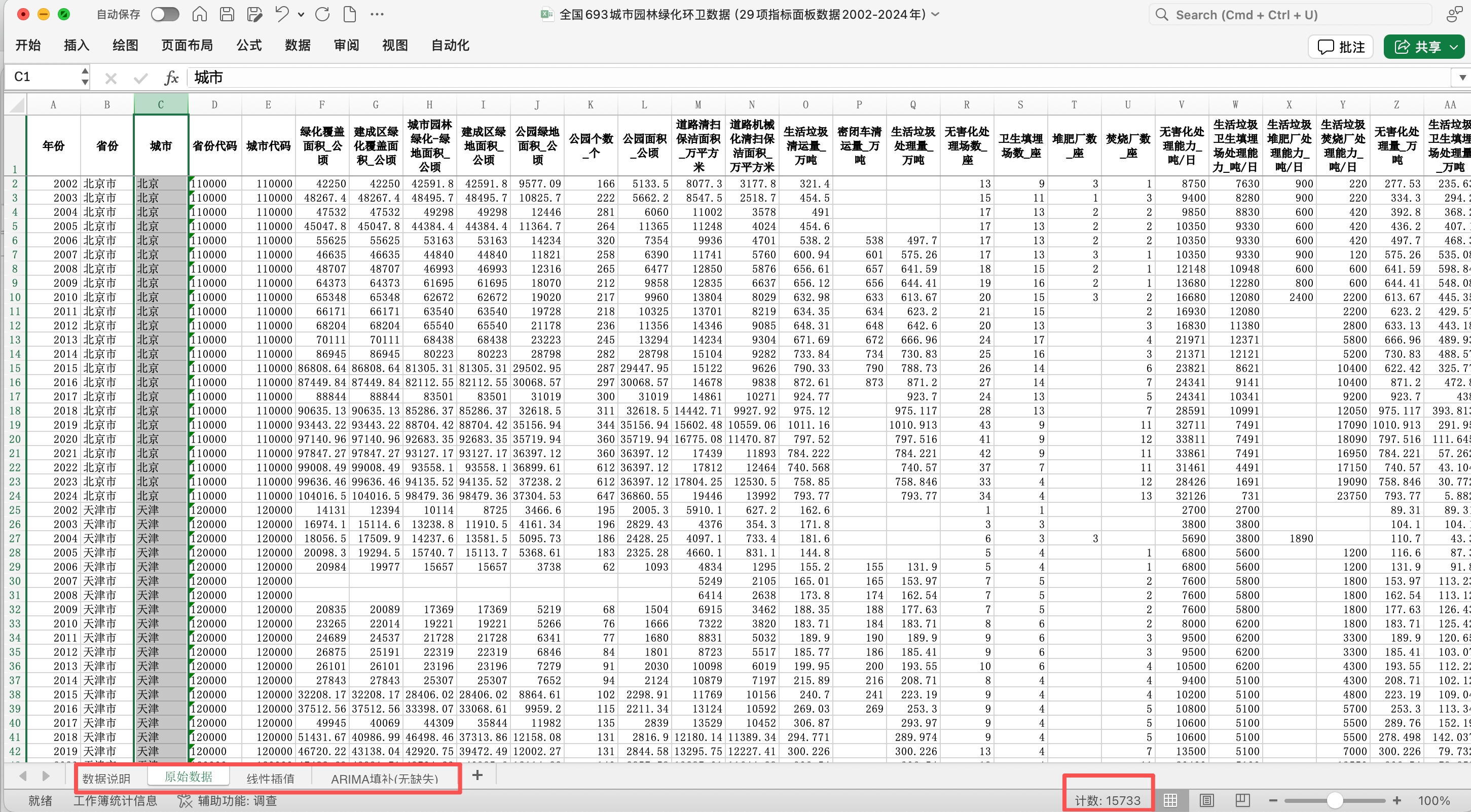 全国693城市园林绿化与市容环境卫生数据(含绿地绿化覆盖、垃圾处理及环卫设施29项指标面板2002-2024年)
