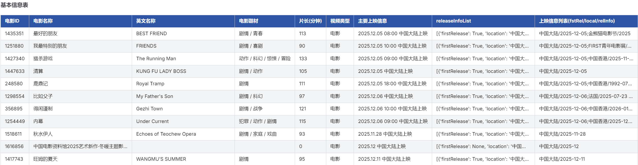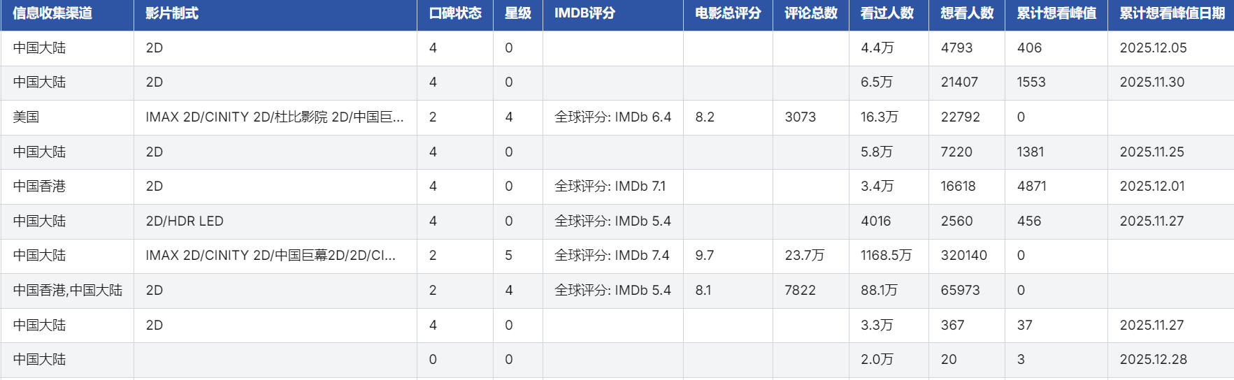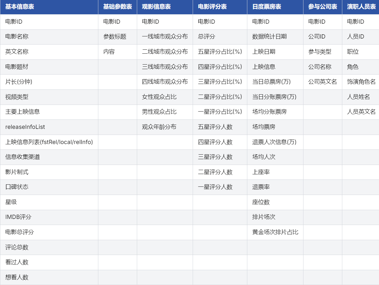 - 多维度覆盖,信息全面:数据库包含电影基本信息(题材、片长、上映信息、制式等)、评分分布(五星至一星评分人数及占比)、观众画像(城市线级分布、性别比例、年龄结构)、参与公司及演职人员信息等,满足多角度分析需求。