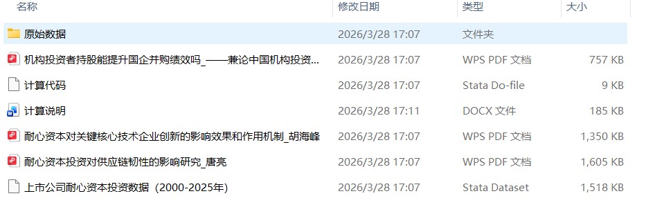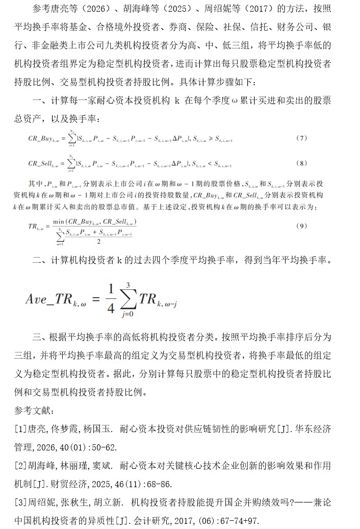 参考周绍妮等(2017)、唐亮等(2026)、胡海峰等(2025)的研究方法,从机构投资者的交易行为特征出发,通过换手率指标识别耐心资本投资。依据计算出的年度平均换手率对所有样本机构进行排序。参考周绍妮等(2017)的处理方式,将样本分为高、中、低三组。将平均换手率最低的三分之一组界定为“稳定型机构投资者”(即耐心资本),将平均换手率最高的组定义为交易型机构投资者。据此,分别计算每只股票中的稳定型机构投资者持股比例和交易型机构投资者持股比例。