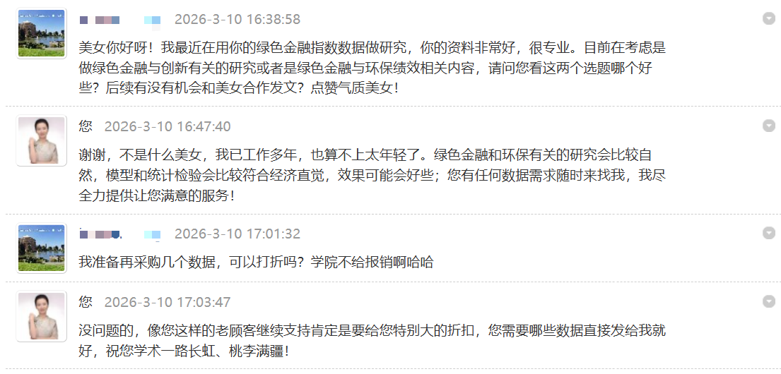 原创数据,请勿转售获利;数据文件售出后无法退换,与本贴描述保证一致,请确认有需求后购买。我发布的资料可以实现论坛内24小时在线答疑解惑,欢迎您咨询各大方向的科研数据,批量购买可享大额优惠。本人在职科研青椒一枚(数量经济与金融统计方向),深知学术不易,入驻论坛5年分享数据质量有目共睹,下附用户好评沟通截图,包售后,有问题随时在论坛私信交流。