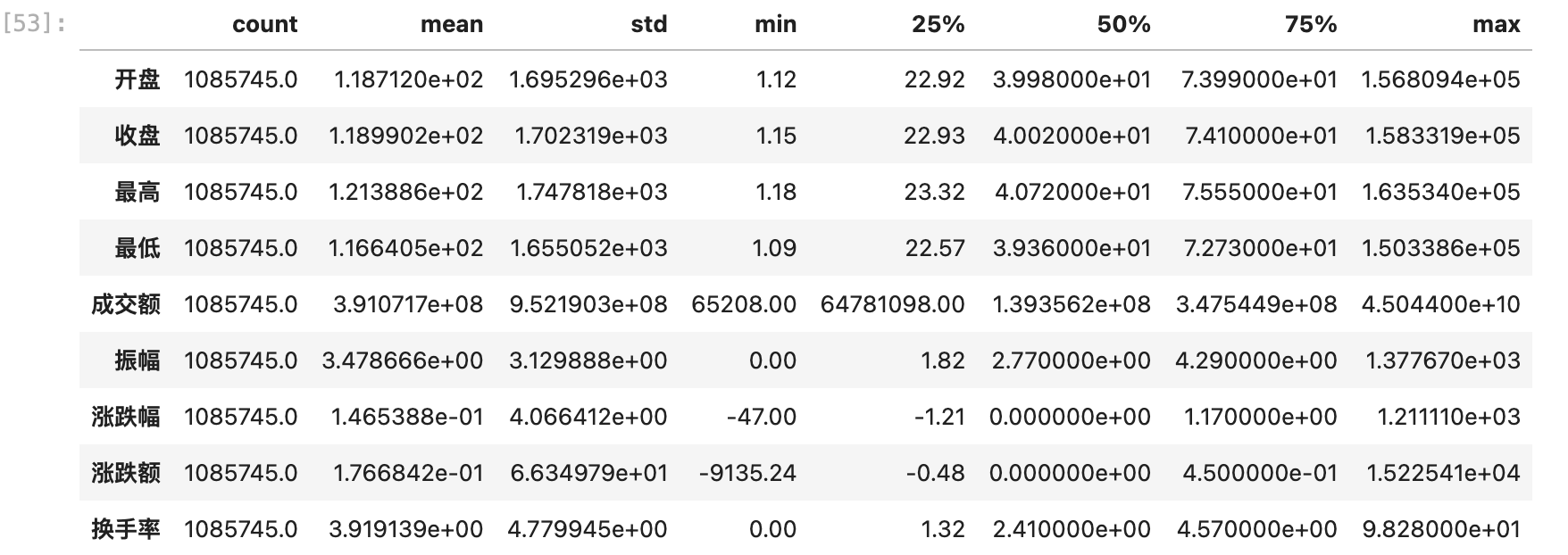 Data columns (total 14 columns): # Column Non-Null Count Dtype --- ------ -------------- ----- 0 日期 1085745 non-null object 1 股票代码 1085745 non-null object 2 开盘 1085745 non-null float64 3 收盘 1085745 non-null float64 4 最高 1085745 non-null float64 5 最低 1085745 non-null float64 6 成交量 1085745 non-null object 7 成交额 1085745 non-null float64 8 振幅 1085745 non-null float64 9 涨跌幅 1085745 non-null float64 10 涨跌额 1085745 non-null float64 11 换手率 1085745 non-null float64 12 代码 1085745 non-null object 13 名称 1085745 non-null object dtypes: float64(9), object(5)memory usage: 116.0+ MB
