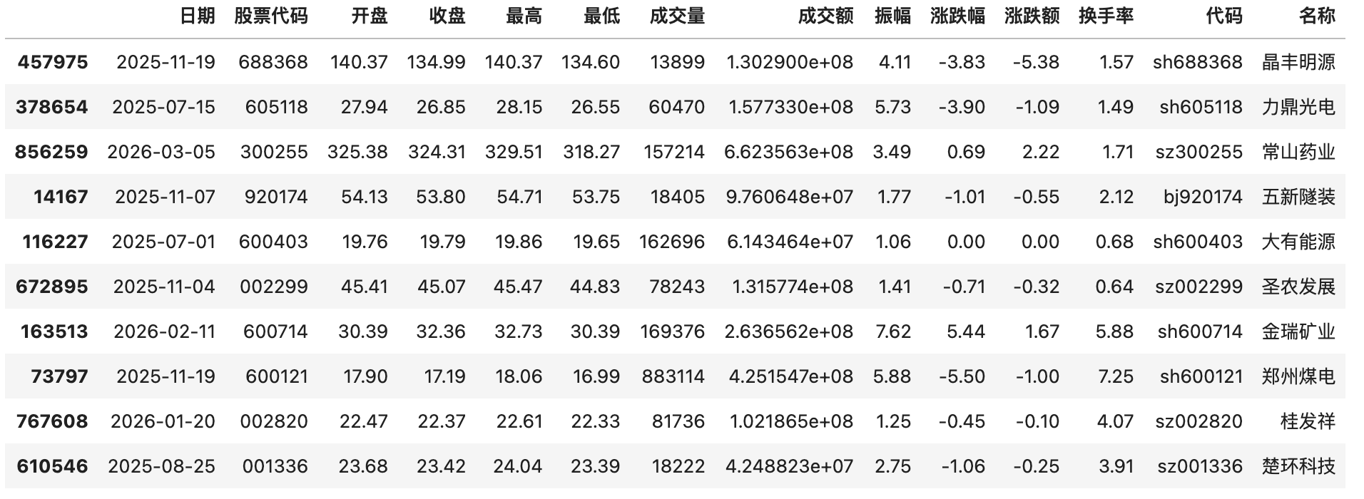 包含每天的开盘价、收盘价、最高价、最低价、成交量、成交额、振幅、涨跌幅、涨跌额、换手率、交易场所+股票编码、股票中文名称。