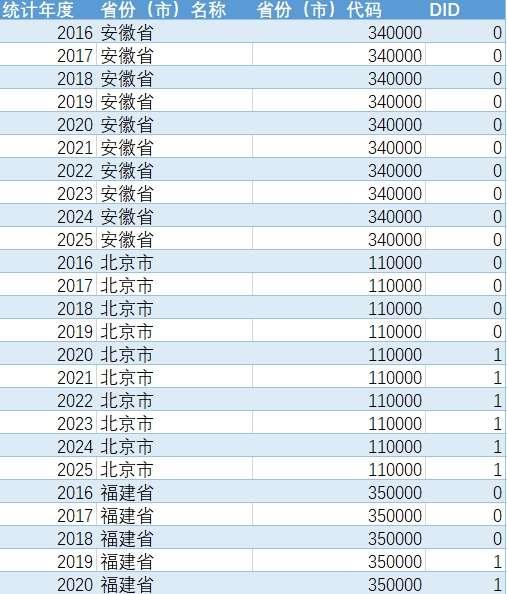 参考Ke Liao , Le Lin b, Yukun Sun (2025)的研究设计,采用多期双重差分法(DID)评估政策效应。定义Treat变量为试点城市虚拟变量(获批城市取1,否则为0),Post变量为时间虚拟变量(试点年份及之后取1)。由于上海市的区块链电子发票试点政策发布于12月31日,因此本数据及将上海市的试点开始时间归为次年,核心解释变量DID(Treat×Post)捕捉试点政策的净效应。