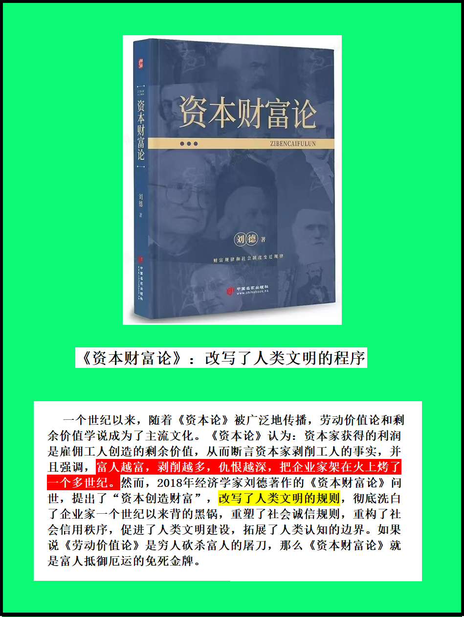 “资本财富论”是“劳动价值论”的修正和发展,也是当今世界经济学最前沿的科学和理论。“资本财富论”就是指资本创造财富,在解释富人为什么越来越富时体现出强大的生命力,从而钝化了《政治经济学》的锐度,缓解了企业家与雇佣工人的尖锐关系,消除了资产阶级与无产阶级近二百年以来的隔阂,提倡多元文化的融合,有利于人们树立正确的方法论和世界观,重塑社会诚信规则,重够社会信用秩序,为世界的和平与稳定做出了贡献,应该获得诺贝尔和平奖。