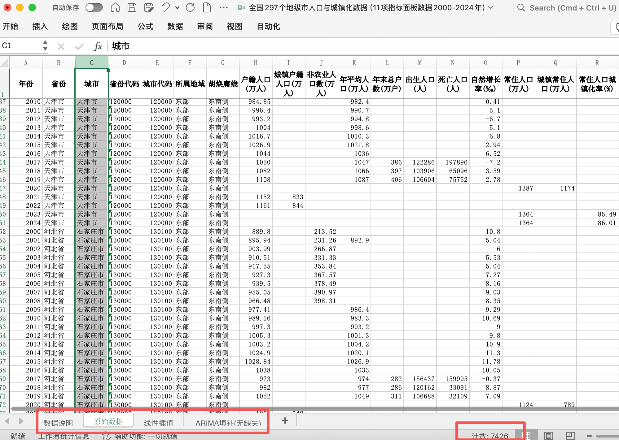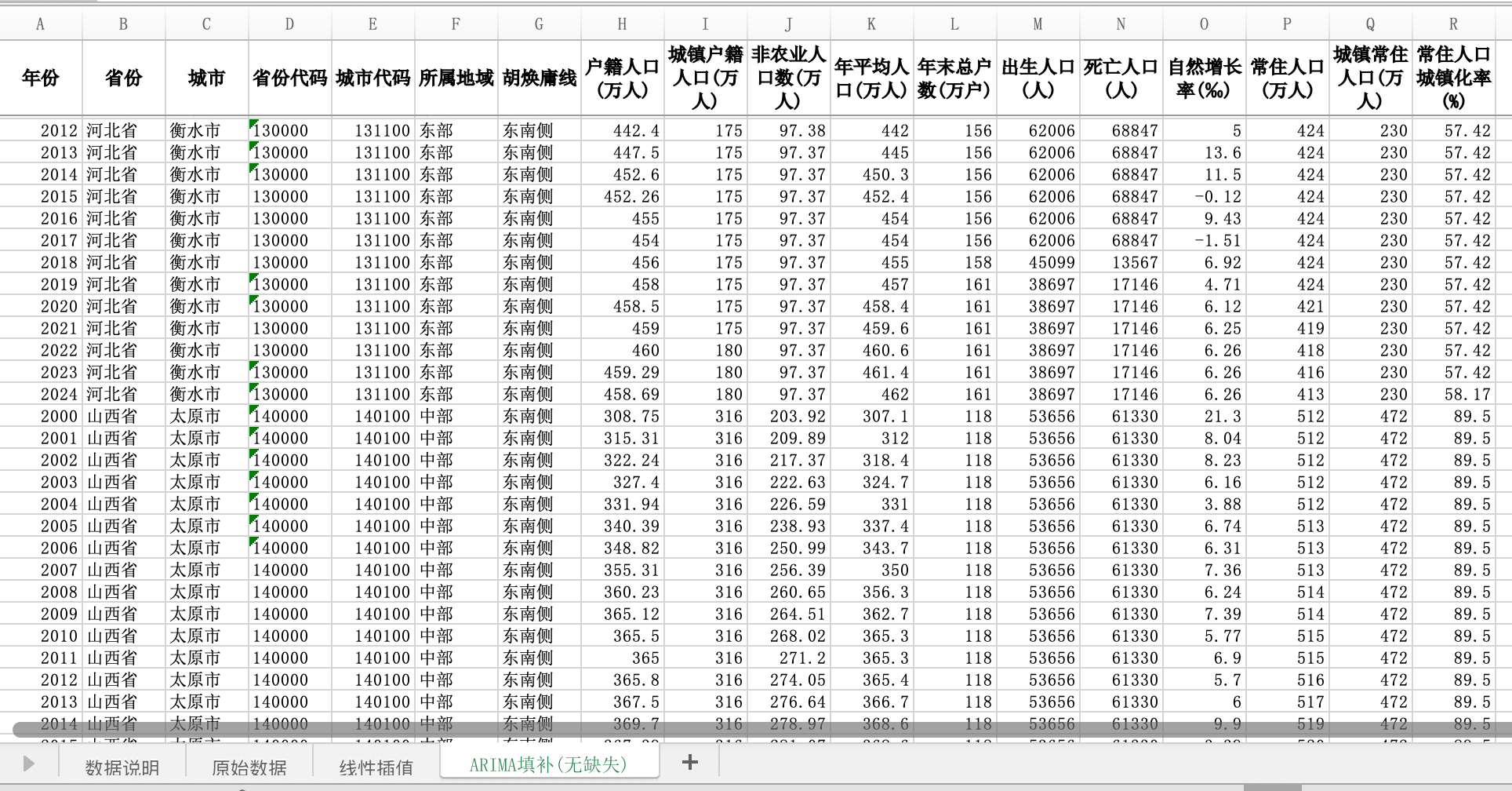 数据版本:Excel格式,含原始数据版、线性插值版、ARIMA填补版(无缺失)