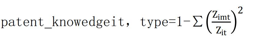 其中,Zimt为企业i截至t年在大组下不同 type 专利申请或获得授权的累计数目,Z为企业i截至t年在全部大组下专利申请或获得授权的累计数目。