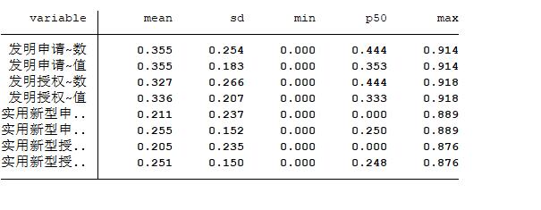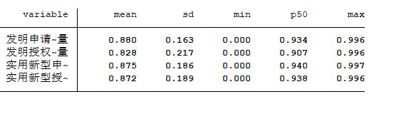 (1)具体计算方法为: patent_knowedgent, type=1-Σα 2, 其中,表示专利分类号中各大组分类所占比重。(2)根据“企业-年份-专利类型”这三个维度,将发明公布、发明授权、实用新型申请、实用新型授权层面的知识宽度信息加总到企业层面。为此,研究采用两种类型的加总方法:一是均值法;二是中位数法。