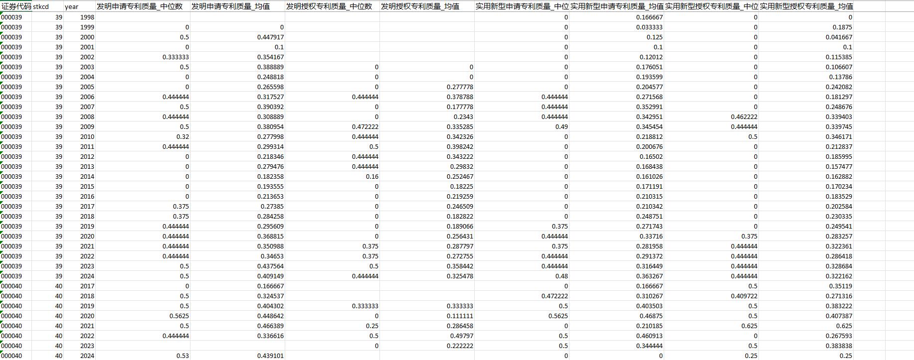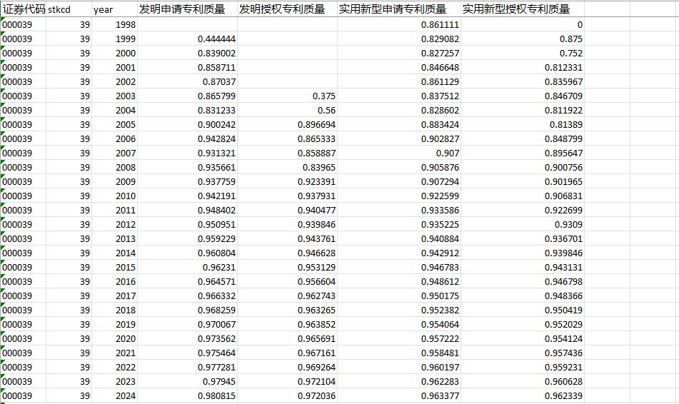 结果包含指标:发明申请专利质量_中位数、发明申请专利质量_均值、发明授权专利质量_中位数、发明授权专利质量_均值、实用新型申请专利质量_中位数、实用新型申请专利质量_均值、实用新型授权专利质量_中位数、实用新型授权专利质量_均值