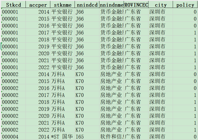 Stkcd accper stknme nnindcd nnindnme PROVINCECD city policy