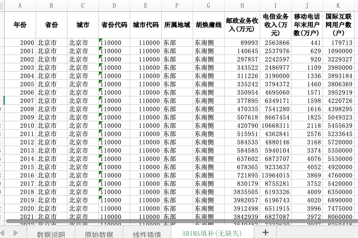 数据版本:Excel格式,含原始数据版、线性插值版、ARIMA填补版(无缺失)