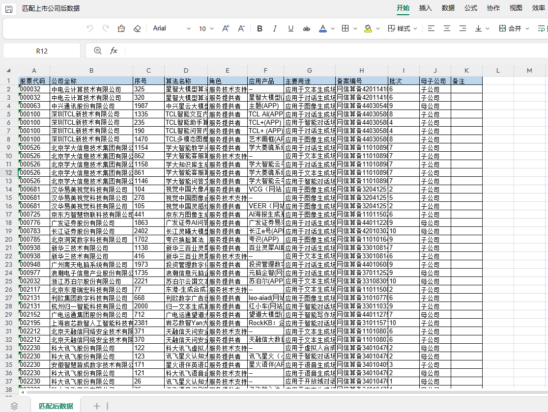 股票代码 公司全称 序号 算法名称 角色 应用产品 主要用途 备案编号 批次 母子公司 备注