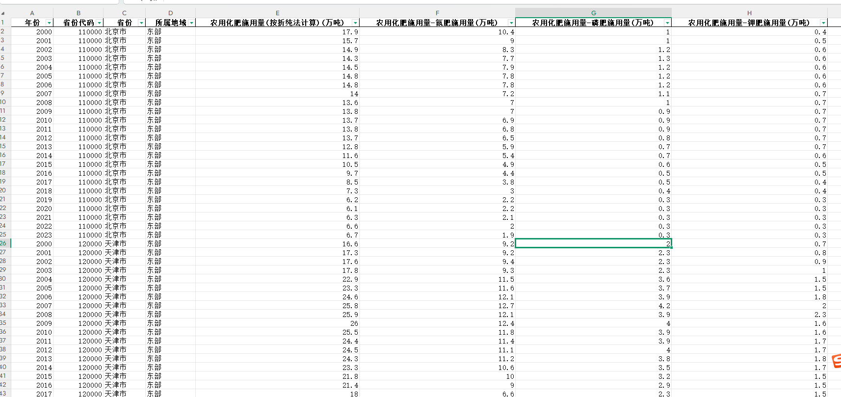 3、指标:年份、省份代码、省份、所属地域、农用化肥施用量(按折纯法计算)(万吨)、农用化肥施用量-氮肥施用量(万吨)、农用化肥施用量-磷肥施用量(万吨)、农用化肥施用量-钾肥施用量(万吨)、农用化肥施用量-复合肥施用量(万吨)、农用塑料薄膜使用量(吨)、农用塑料薄膜使用量-地膜使用量(吨)、农用塑料薄膜使用量-地膜覆盖面积(公顷)、农用柴油使用量(万吨)、农药使用量(吨)