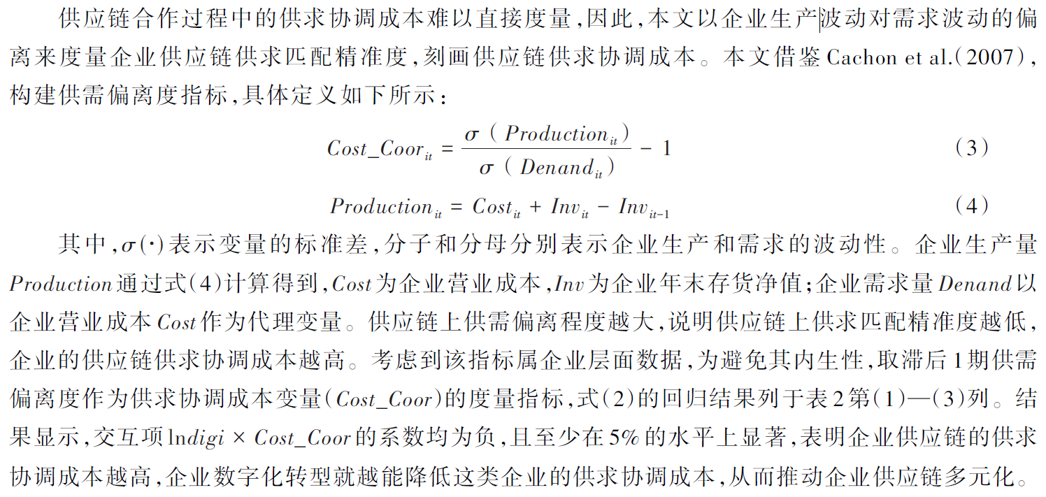 注:供需偏离度Cost_Coor是供求协调成本的正向指标,即企业供应链供需偏离度Cost_Coor越大,企业供应链供求协调成本越大,该变量在参考文献1中作为机制变量使用,可用于机制检验。