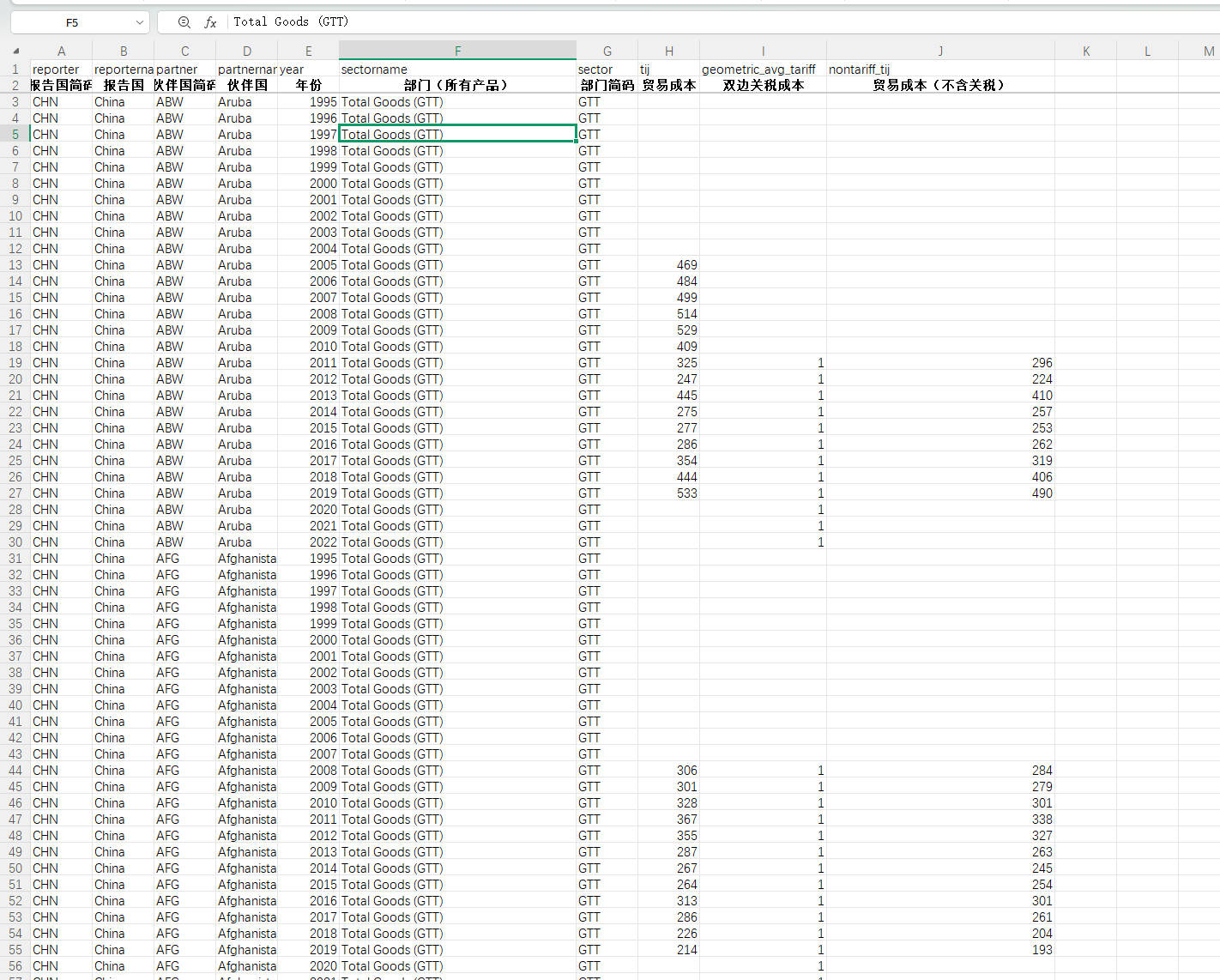 nontariff_tij(贸易成本不含关税):剔除关税后的综合贸易成本,从价等值百分比