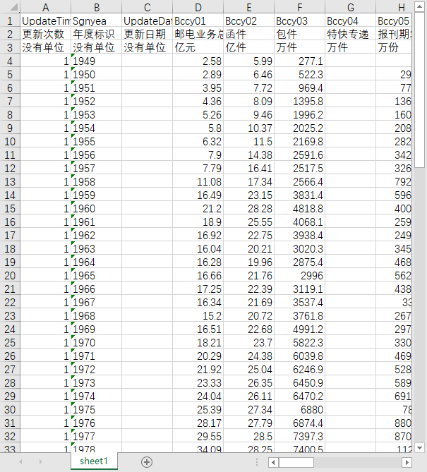 更新次数 年度标识 更新日期 邮电业务总量 函件 包件 特快专递 报刊期发数 长途电话 年末无线寻呼电话用户 年末移动电话用户 本地电话年末用户 城市电话用户 城市住宅电话用户 乡村电话用户 乡村住宅电话用户 邮电局所 邮路及农村投递路线总长度 长话业务电路 长途光缆线路长度 长途电话交换机容量 局用交换机容量 移动电话交换机容量 电话机