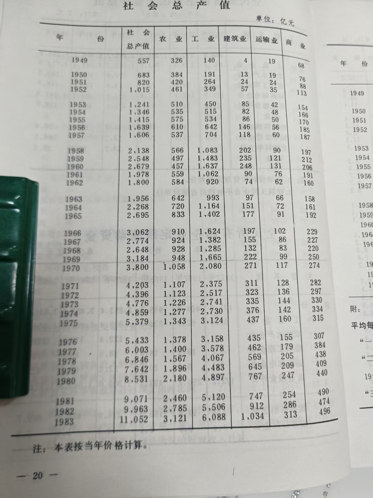 年度 | 工业总产值:亿元 | 工人人均产值:元 | 工业产品出厂价格指数 | 价格变动导致的产值增加额:亿元 | 数量变化导致的产值增加额:亿元 | 总消耗(物化成本及折旧):亿元 | 总消耗占产值比:% | 国民收入(剩余价值):亿元 | 剩余价值占产值比:% | 税金占总收入比:% | 工人人均创造国民收入:元 | 总收入占总消耗比:% | 不包括人工成本的管理费财务费及累积性资产:亿元 | 利润额:亿元 | 成本利润率: % | 产值利润率:% |
