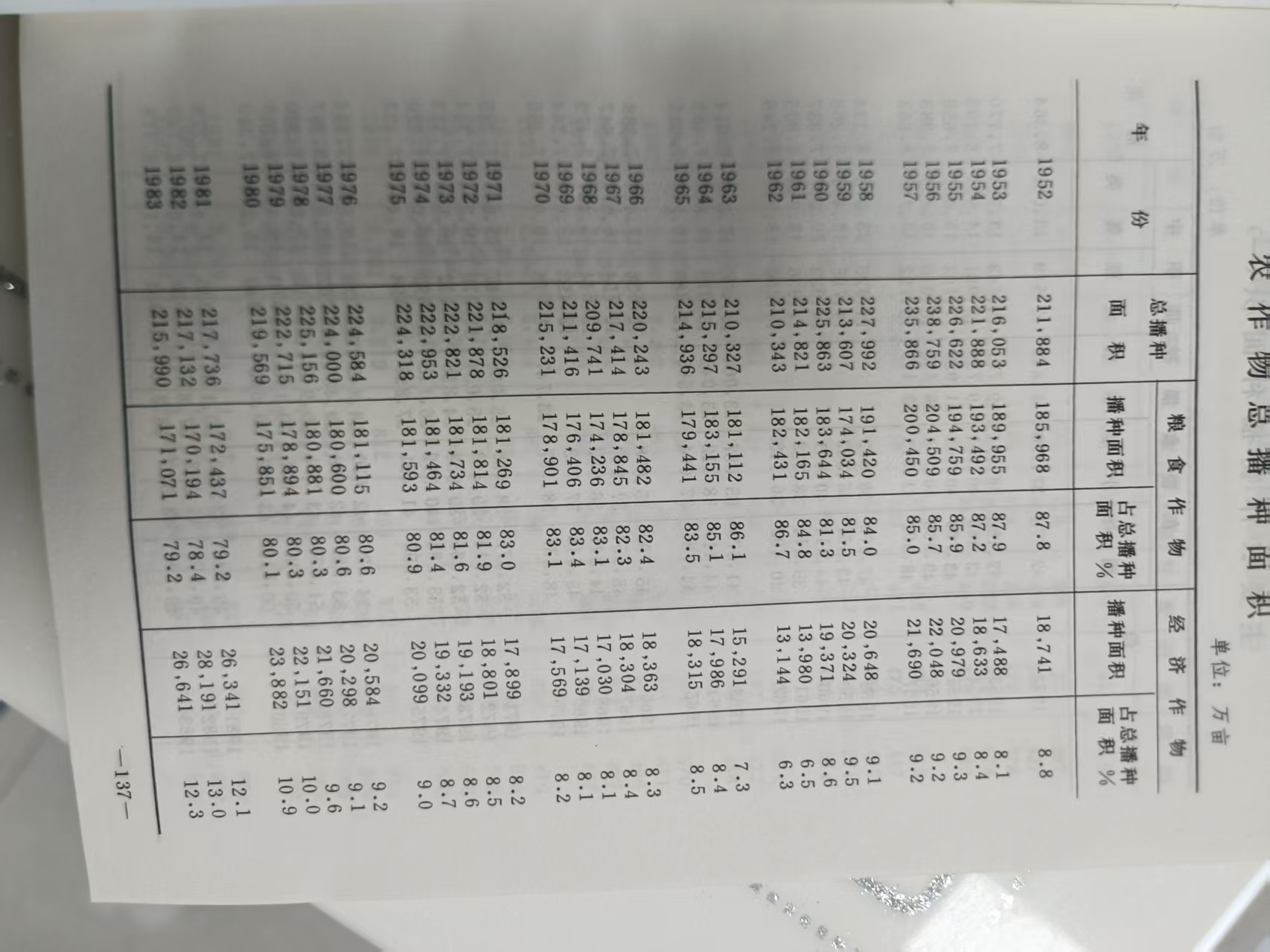 从土地资源配比来看(附件 5 表),1952 年农业播种面积 211884 万亩,1978 年增至 225156 万亩,仅增加 13272 万亩,耕地增长幅度远低于农村人口增长幅度。农村人口人均耕地面积从 1952 年的 4.21 亩锐减至 1978 年的 2.85 亩,净减 1.36 亩,人地矛盾持续激化,进一步加重了农村资源承载负担。