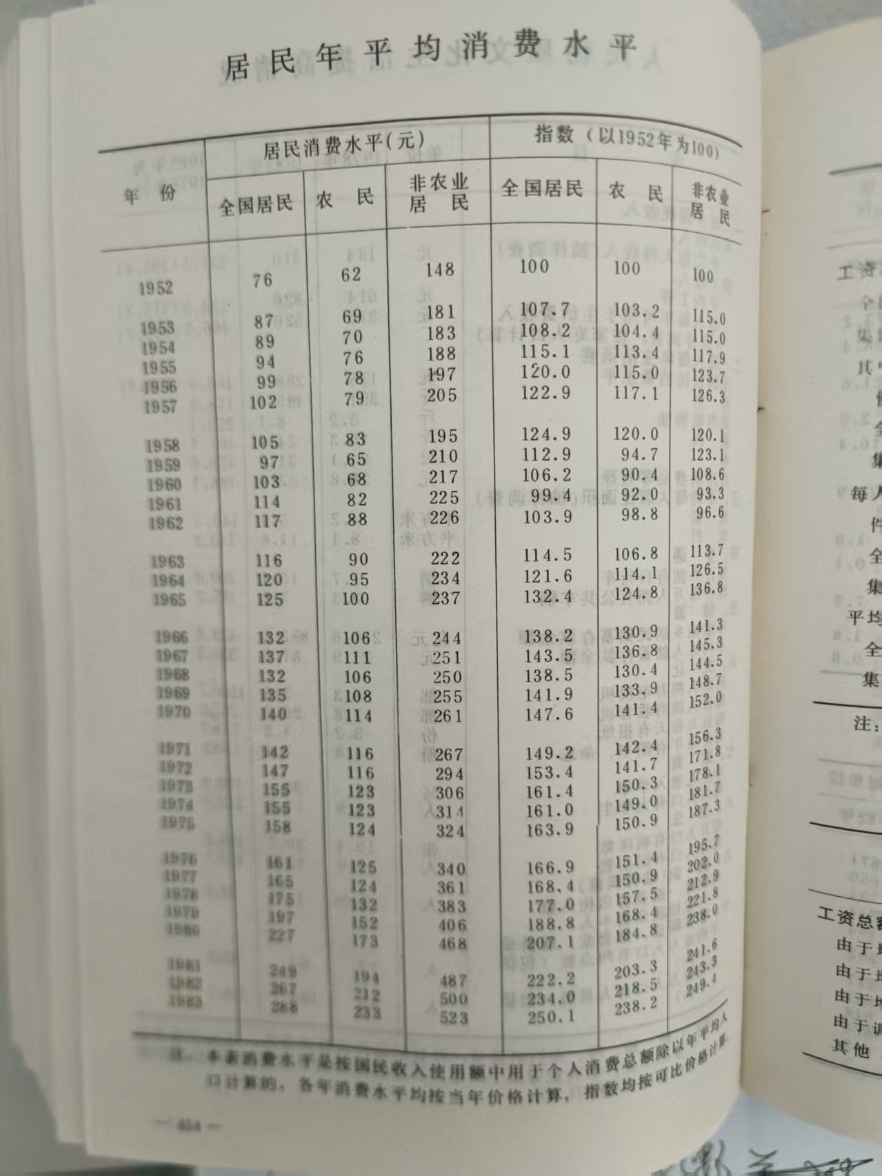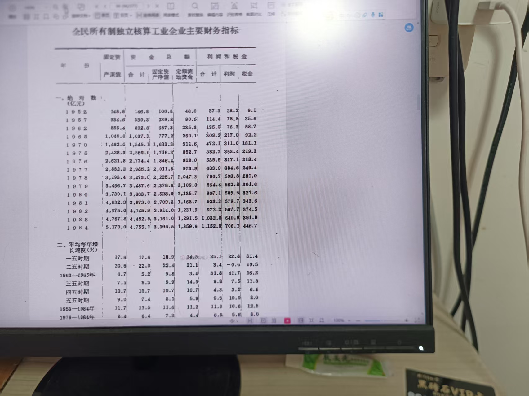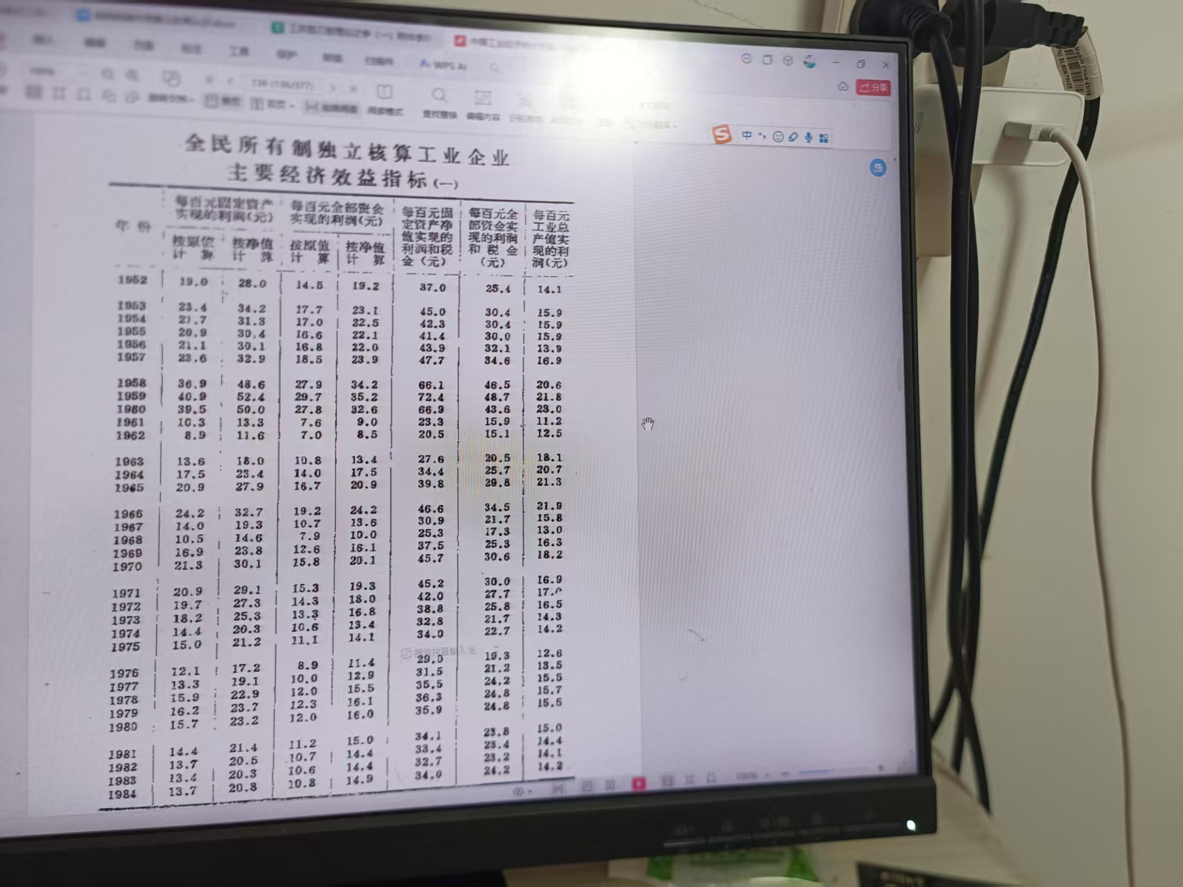 1952年工业总产值349亿元,国民净收入115亿元,税金9.1亿元,不含人工成本和折旧的管理费用、财务费用等24.26亿元,显性工资24.6亿元,隐性工资7.835亿元,工人总数533万人,人均抚养人口4.47人,人均生存标准148元,职工所需生存成本合计661.34元/年,人均显性工资515元/年,人均隐性工资147元/年,工人全口径人均收入超出生存成本0.66元/年/。工业总成本利润率16.41%。