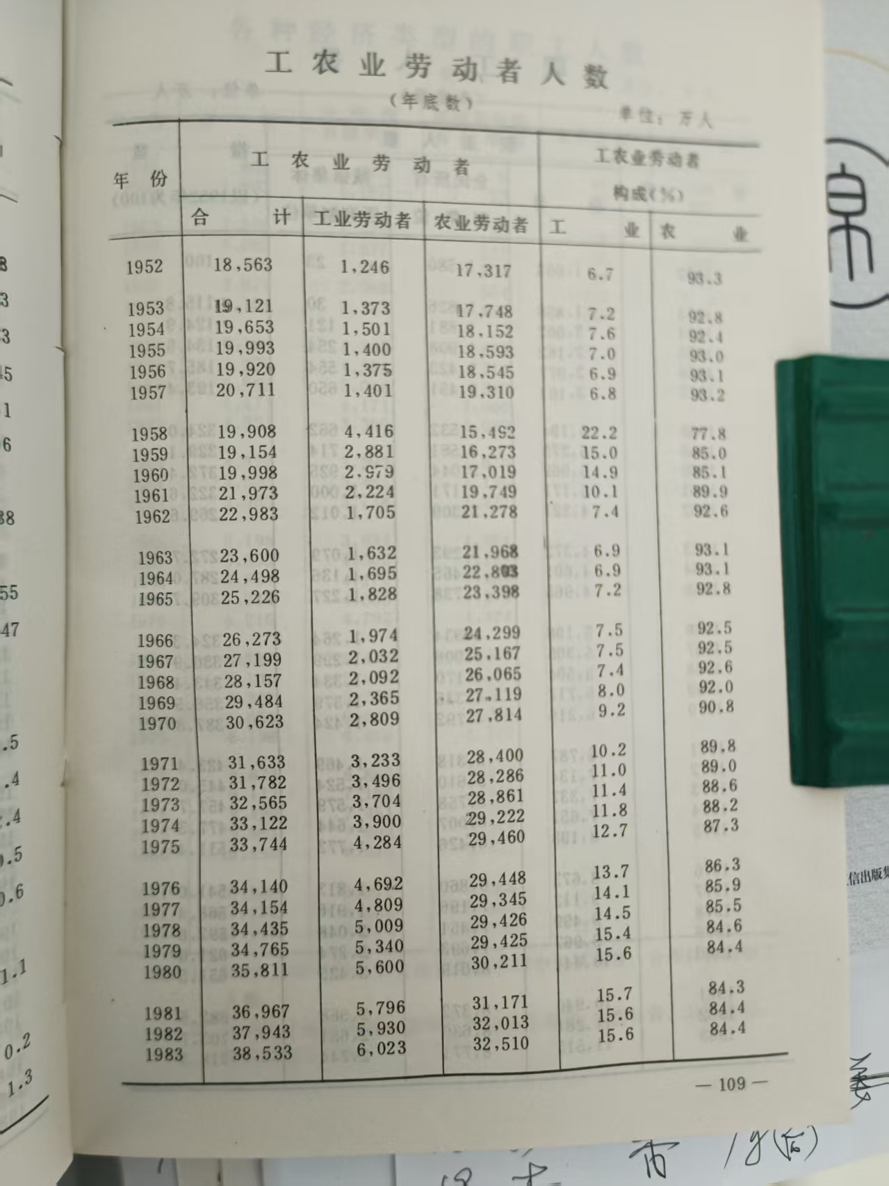 说明基期工业利润偏离成本程度高于农业,但是,工人全口径收入超出生存成本额度低于农民。而到1978年因农村人口的增加,这一格局发生反转;