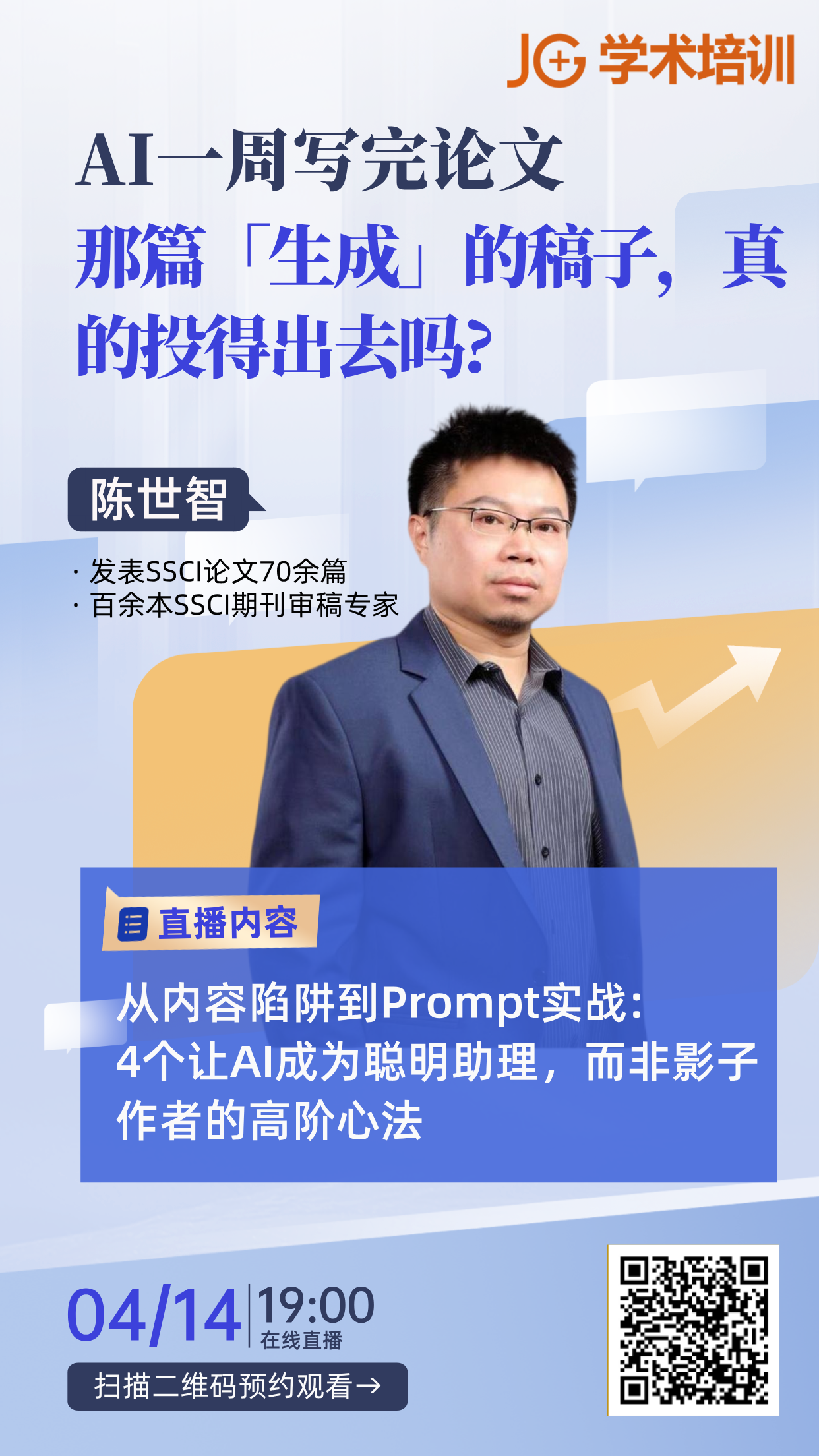 JG 学术培训特邀发表 SSCI 论文 70 余篇、百余本SSCI 期刊审稿专家陈世智老师,带来免费专题直播:《AI 一周写完论文,那篇「生成」的稿子,真的投得出去吗?》