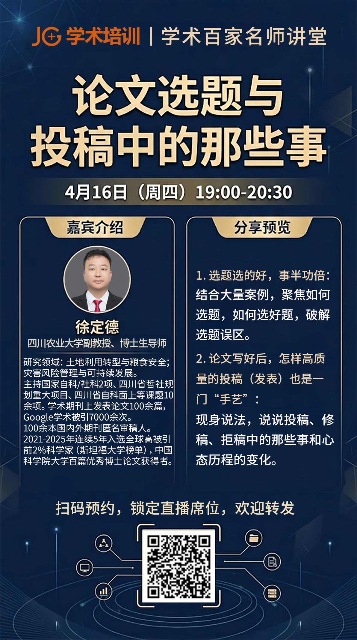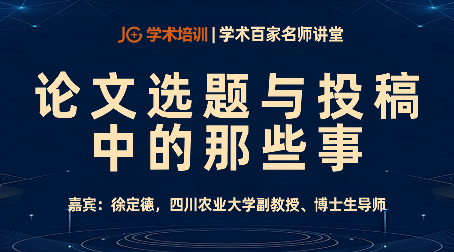 JG 学术培训「学术百家名师讲堂」·独家学术公益直播讲座特别邀请到四川农业大学徐定德老师,为你拆解「论文选题与投稿中的那些事」,手把手教你搞定论文发表全流程!