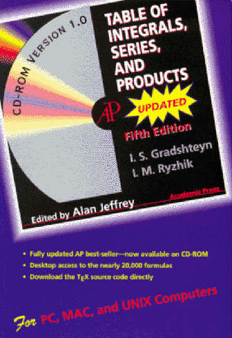 This Fifth Edition of the best-selling Table of Integrals, Series, and Products is now available on CD-ROM. Designed for use by mathematicians, scientists, and professional engineers who need to solve complex mathematical problems, the CD-ROM offers full-text searchability and desktop computer access to the formulas contained in this essential reference. The TEX source code for selected formulas will also be included on the CD-ROM. Users can access formulas anddirectly download them into their own TEX documents.