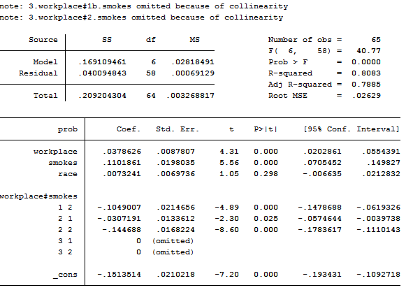 regress prob workplace smokes race workplace#smokes [aw=pop]