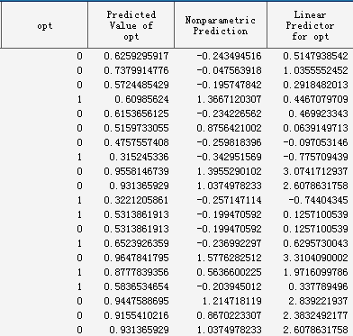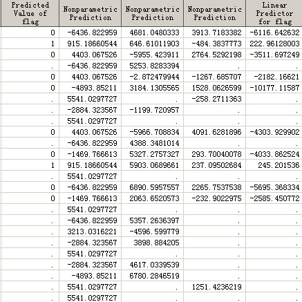 flag是个二分类变量,之前用logistic回归效果一般,现改用非参数logistic回归分析,预测结果类似:-2.12298E76