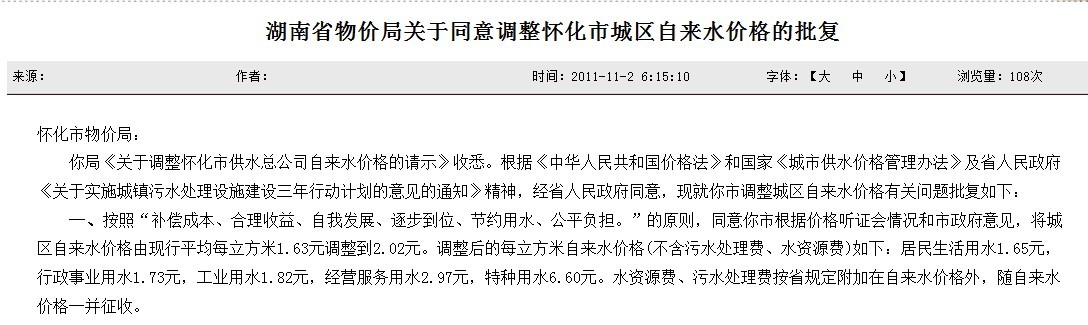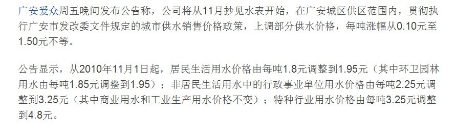 4、经营服务用水由0.55元/立方米调整为1.30元/立方米;