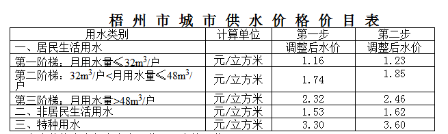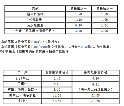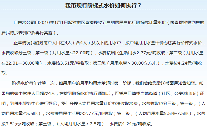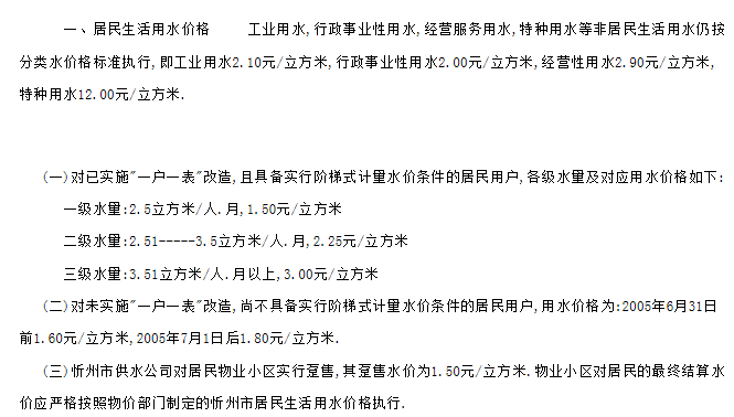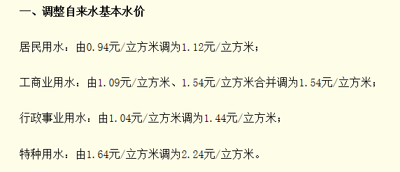 ●居民用水的终端价格即:1.70元(供水单价,含0.10元的六水源建设基金)+0.06元(水资源费)+0.085元(城市公用附加费5%)+0.82元污水处理费=2.66元/立方米。按照西宁市居民每户每月平均用水支出13.30元,占月均可支配收入的0.33%,这一调整幅度在居民可承受范围之内,对居民家庭生活基本不会产生大的影响。