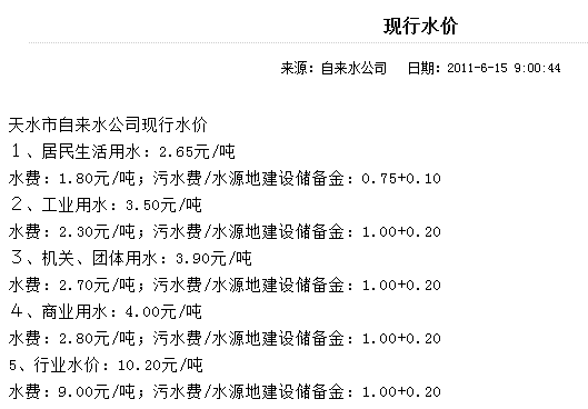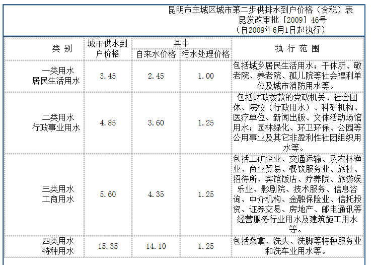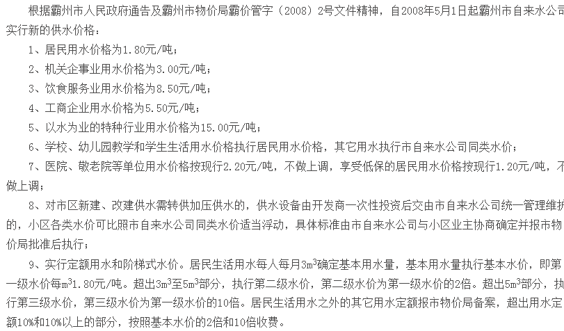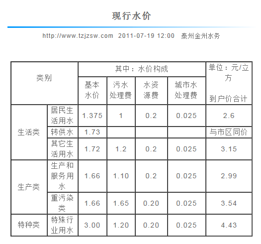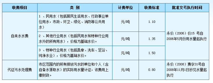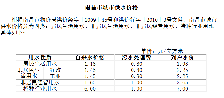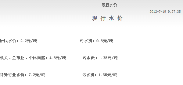 ●特种行业用水终端价即:10.00元(供水单价,含0.1元的六水源建设基金)+0.16元(水资源费)+0.50元(城市公用附加费5%)+1.5元污水处理费=12.16元/立方米。(特种行业用水指:是以水为原料的生产企业及经营用水,如纯净水、矿泉水、饮料、啤酒生产、高档桑拿洗浴会所、游泳池、足浴、美容美发、茶艺、KTV娱乐、洗车等行业。)