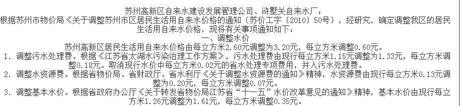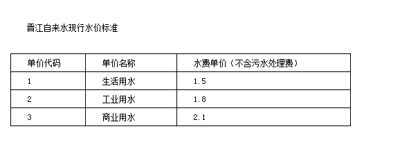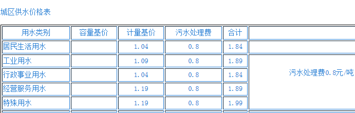 ●非居民用水终端价即:1.99元(供水单价,含0.1元的六水源建设基金)+0.16元(水资源费)+0.10元(城市公用附加费5%)+1.09元污水处理费=3.34元/立方米。